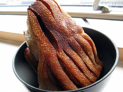 I've used this method of cooking pork belly before. It's lengthy and involves multiple stages of cooking, but the end dish results in tender meat, silky fat and subtle flavours. It's not for the faint of heart; deep frying a piece of pork belly usually results in a fair amount of hot oil being spat all over the kitchen. Squeals can be heard emanating from my terrified but salivating mouth.After an initial boiling to rid the meat of impurities and scum, it is then dried and slid into a wok of bubbling oil until it takes on a gorgeous caramel colour.