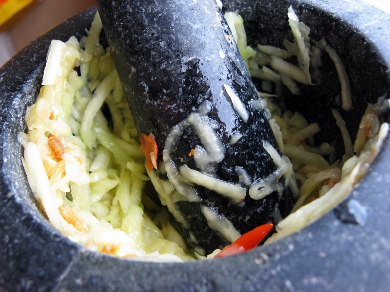 Som tam is one spicy mother of a salad. Memorably, I once visited the Thai Food Festival in Greenwich Park after a heavy girls' night on the ciders (and Campari - bleurgh). I needed fresh clean reviving flavours. Staggering around in the blinding sun, I made my way over to a stall selling som tam; a lady with an enormous mortar and pestle was pounding away, creating this salad. She'd hold up various ingredients - 1 birds eye chilli? Two? Salted crab? - and with a nod or a shake she'd throw them in, and within minutes I had myself a tray of the stuff. Settling down, I took my first bite. My face was engulfed with fiery chilli flames, and I legged it over to the nearest stall, hopping on each foot until I got my hands on a watermelon juice to soothe the pain. Despite all this, it was addictive; salty, spicy, sour and sweet with a hint of fish.