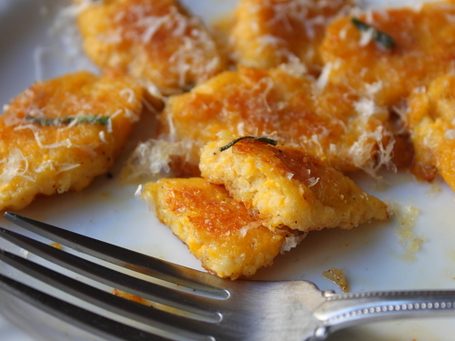 Once your mixture is done, and you let it firm up overnight, you have a few options as far as final service. You can follow the spoon-boil-fry-serve method seen herein, or you can do the spoon-boil part ahead of time, and then fry in the sage butter when ready.