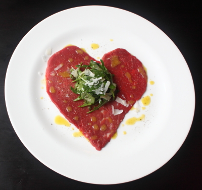 I like carpaccio. My wife and Valentine, Michele, likes carpaccio. So for us, a heart-shaped version of this classic Italian beef salad seems nothing short of fabulous. Of course, I do understand that this isn’t for everyone. If you don’t like, or more likely, are afraid of rare meat, I don’t imagine you’ll be giving this a try.